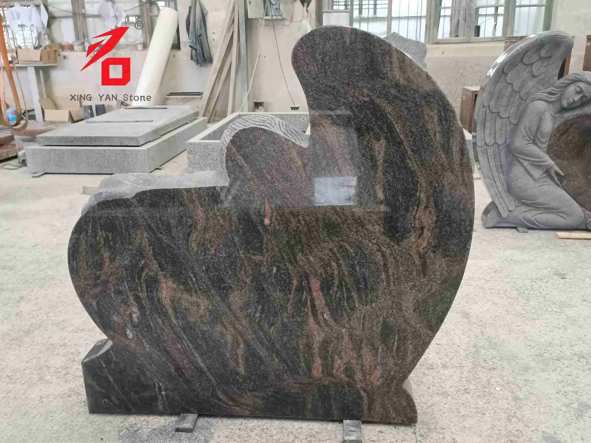Spominski nagrobnik angela v obliki srca iz modrega bisernega granita