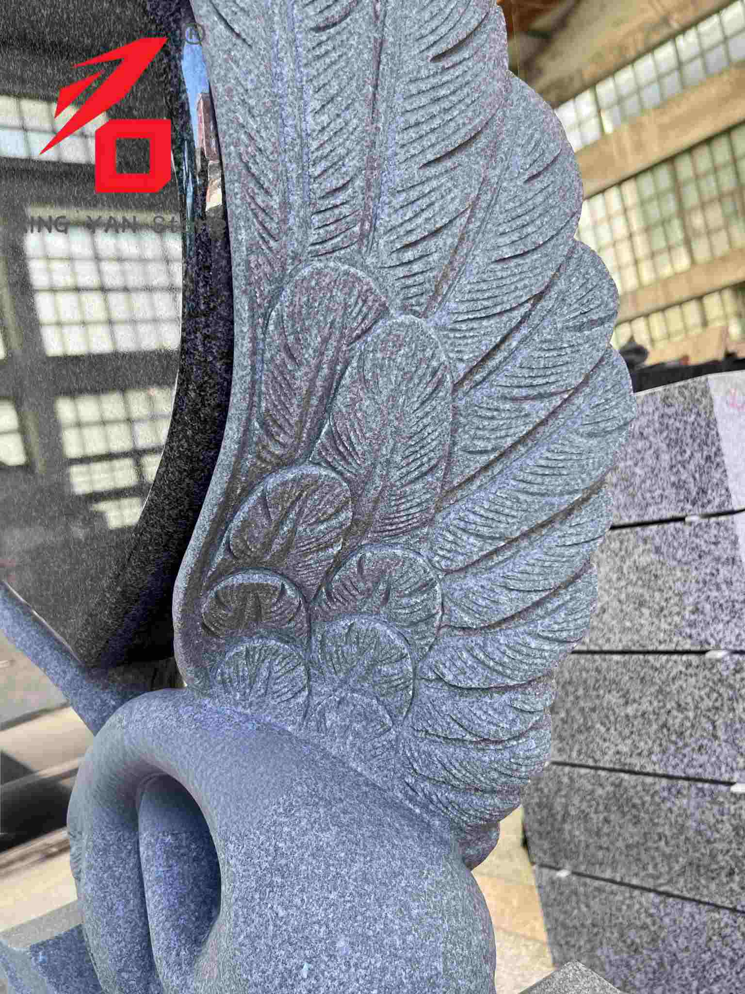Spominski nagrobnik angela v obliki srca iz modrega bisernega granita